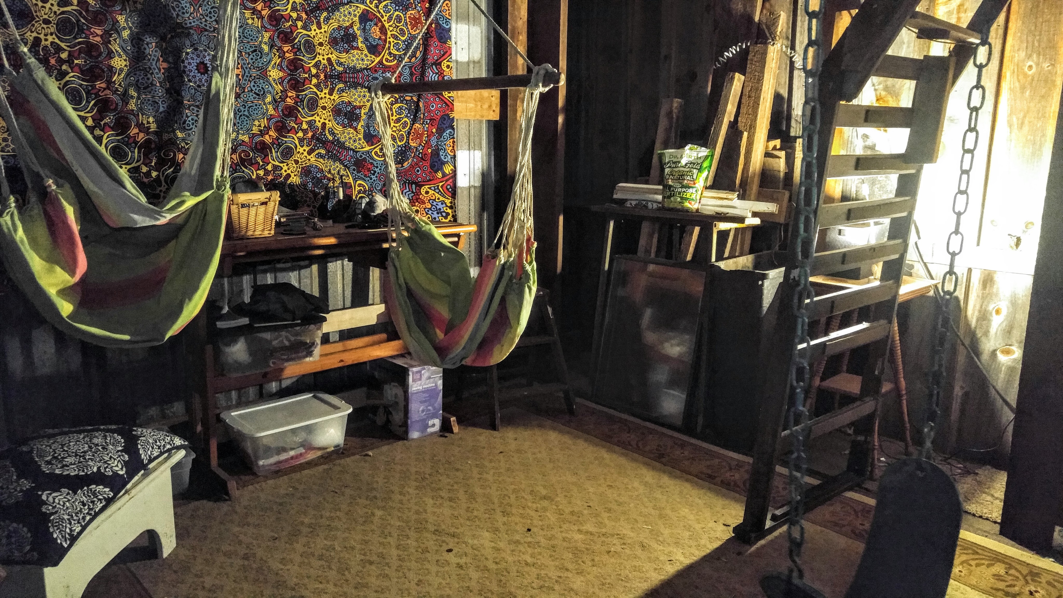 Just getting into the Ninja Hut is fun, as it requires a careful walk up a wooden ramp that gets a little slippery when wet. Luckily, there’s a tree-branch handrail to hold onto and I got fairly used to traversing the boardwalk as I came and went over the course of seven days. Upon entering the makeshift shelter, one is greeted with a few creature comforts, such as a pair of hammock chairs, area rug, and lamp. The ladder, not unlike something out of a cartoon, leads to the loft, where I slept for the duration of my stay.