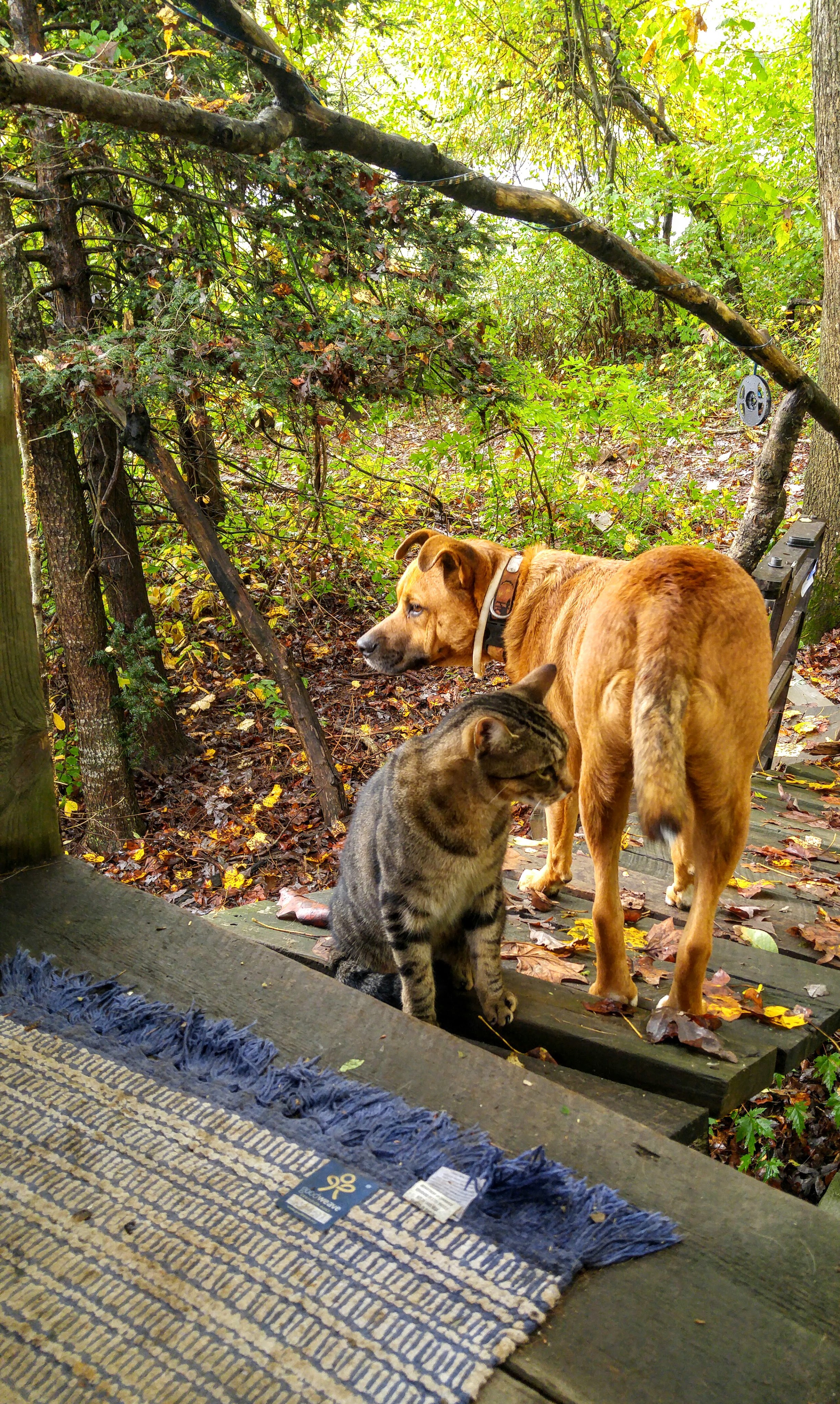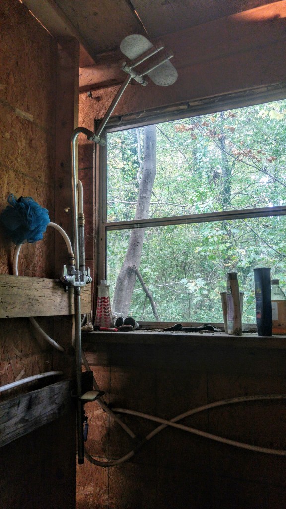 The best part of my stay, by far, was climbing into the loft to sleep at night. A cozy nest in the trees, I lived like a bird…..seeking shelter under the man-made metal roof, listening to the soothing sounds of nature and even the rain, when it came. A few box bugs and a spider or two took refuge with me, but I didn’t mind. Rusty the dog guarded the doorway at night, Pippin the cat shared my lair on a couple of occasions, and a pair of crows greeted me on one of the cool fall mornings.