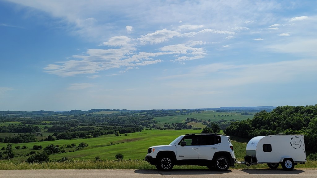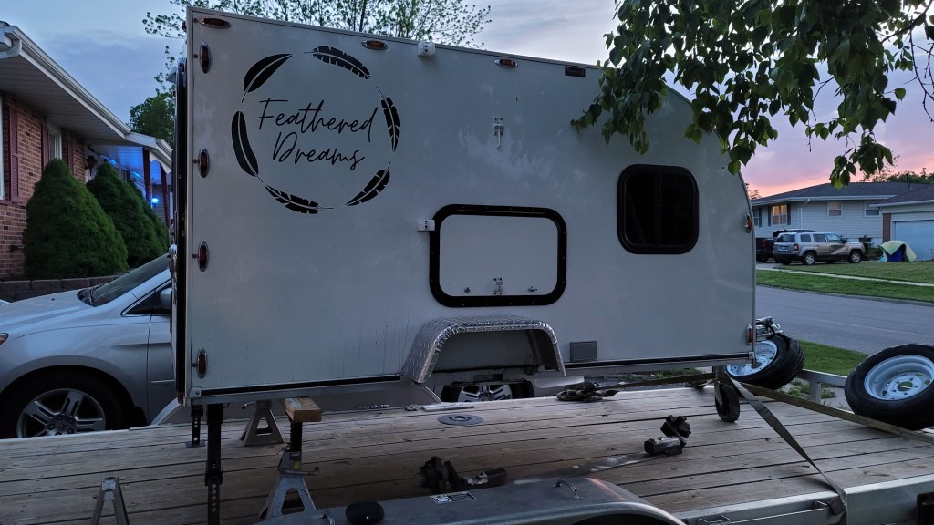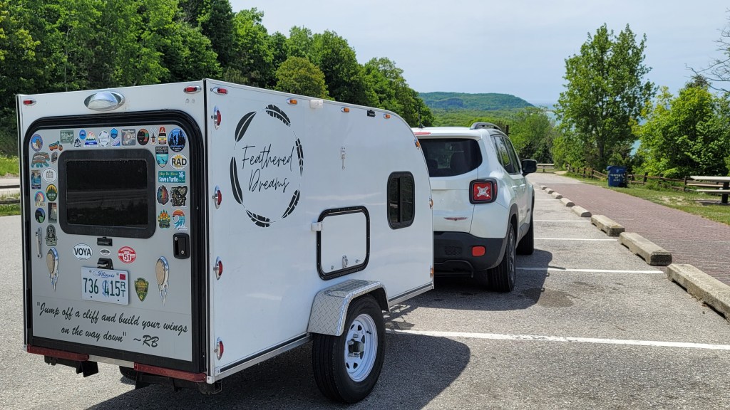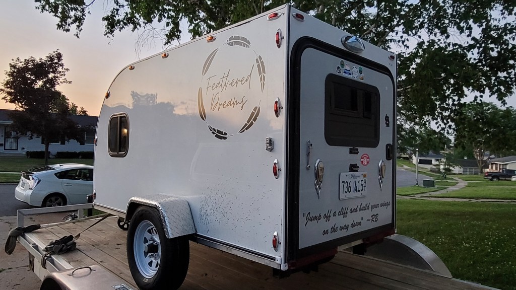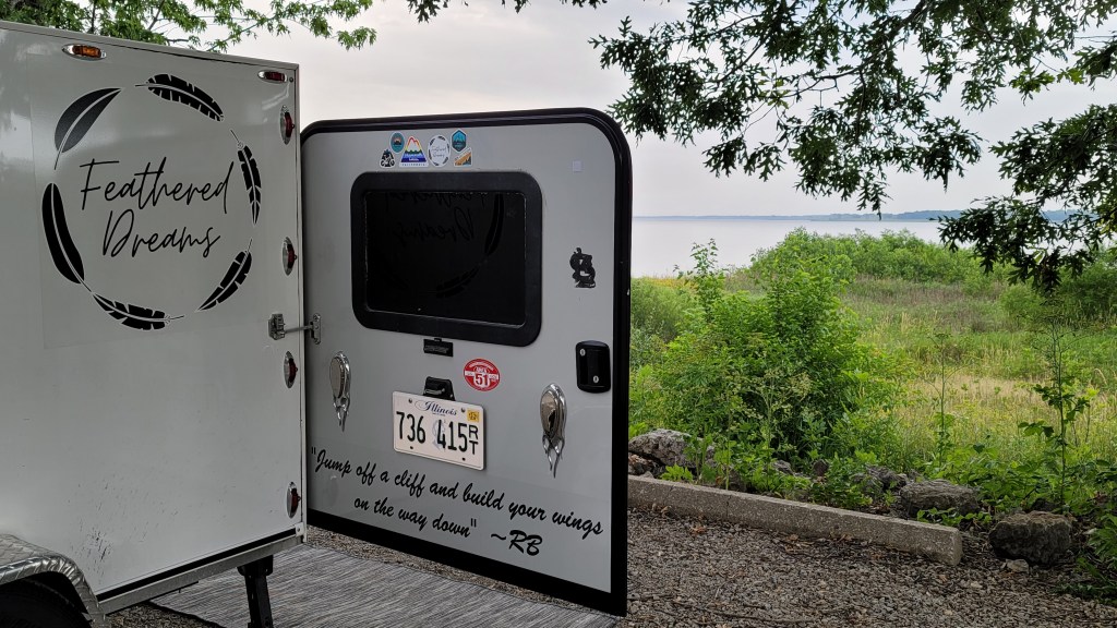 In 2021, I sold a 38-foot school bus and (with the proceeds) bought a home-built square-drop camper. It wasn’t too cozy at first, but I had a vision…. and completely transformed the interior. I also added bigger tires and a few decals on the exterior, but the trailer never really made it out of Iowa that first year due to the axle coming apart on I-80 about 45 minutes east of Omaha. Thankfully, a friend in Cedar Rapids had the means and skills to get it back on the road….a fortunate save, despite my newfound fear to tow it too far after the repair.